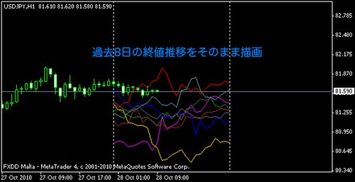 表題の通り、過去8日間の価格変化(終値のライン表示)を重ね描きするインジケータを作ってみました。 ↓Mode = 0 : 単純に価格そのものを平行して並べただけ。 ↓Mode = 1 : 今日の始値を基点として相対価格を表示。 ↓Mode = 2 : 現在の終値を基点として相対…